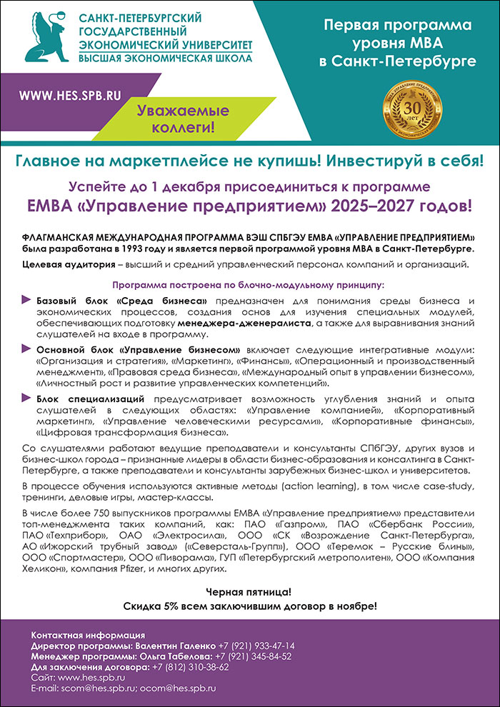 Продолжается набор слушателей на программу ЕМВА «Управление предприятием» 2025–2027