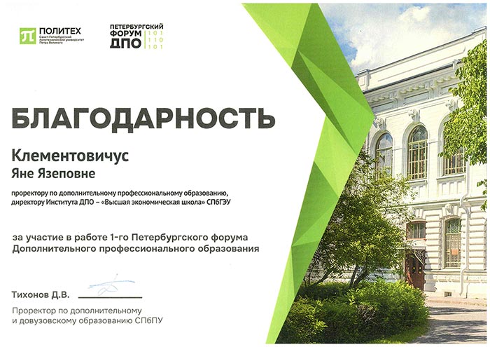 Директор ИДПО - «ВЭШ» СПбГЭУ, проректор СПбГЭУ по ДПО Яна Клементовичус выступила с докладом «Системная подготовка руководителей для достижения целей технологического лидерства» в треке «ДПО как инструмент реализации национальных проектов и достижения технологического лидерства», в рамках Первого Петербургского форума дополнительного профессионального образования в стенах Санкт-Петербургского политехнического университета Петра Великого.