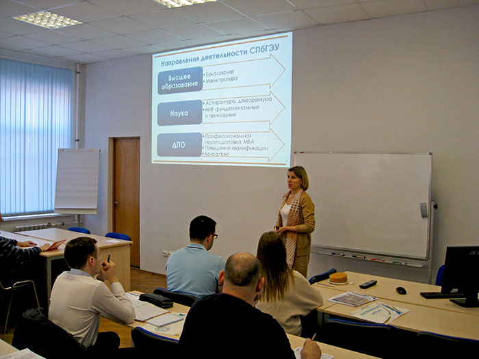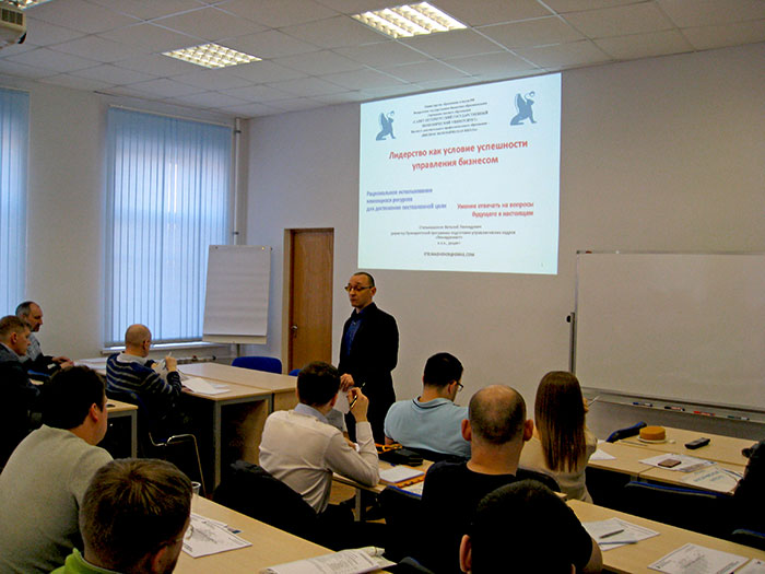 Руководитель программы, к.э.н., доцент кафедры менеджмента и инноваций СПбГЭУ Виталий Леонидович Стельмашонок, рассказал об особенностях обучения на данной программе и представил вниманию собравшимся слушателям вводную лекцию «Лидерство как условие успешности управления бизнесом».