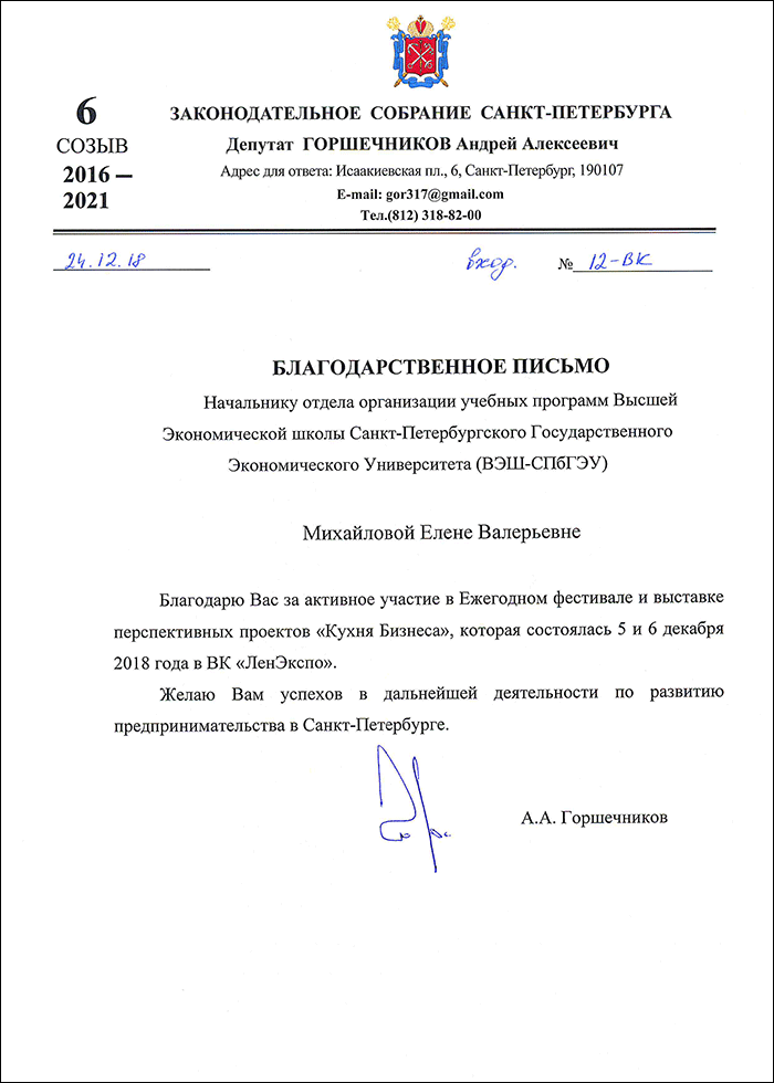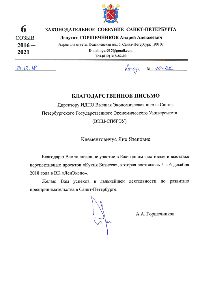 Директор ИДПО – «ВЭШ», д.э.н. Клементовичус Яна Язеповна и ряд сотрудников бизнес-школы отмечены Благодарственными письмами депутата Законодательного собрания Санкт-Петербурга Горшечникова Андрея Алексеевича «за активное участие в Ежегодном фестивале и выставке перспективных проектов «Кухня Бизнеса».