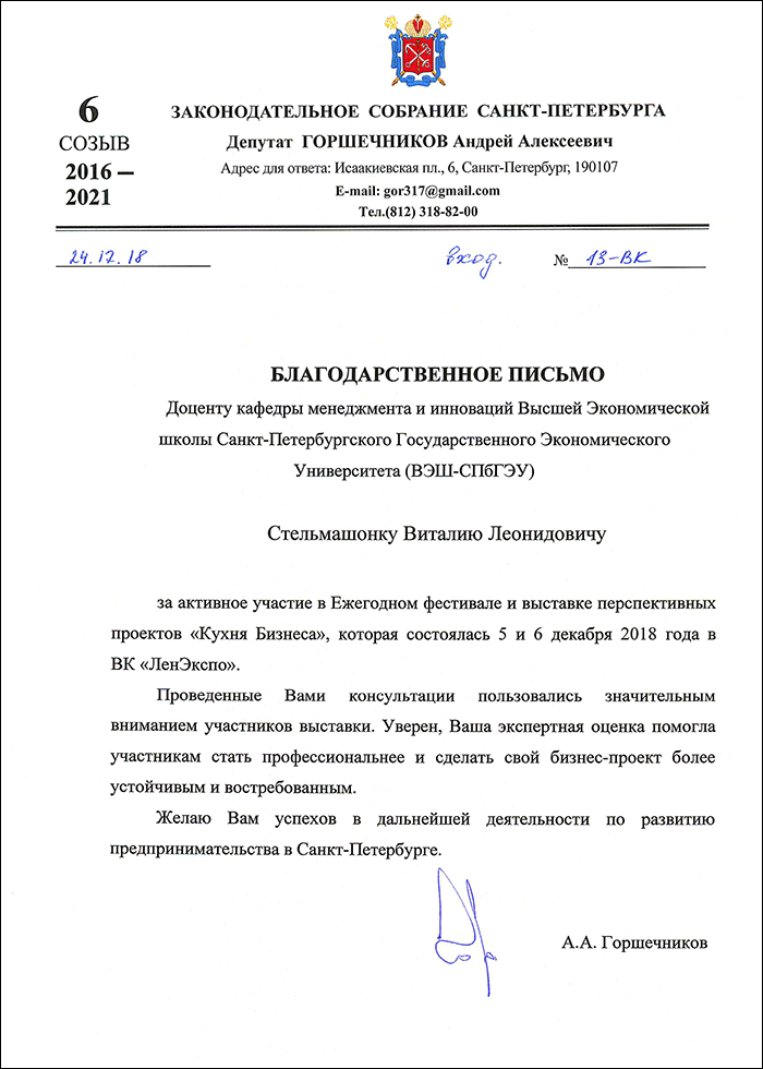 Активное участие в ВЭШ СПбГЭУ в Ежегодном фестивале и выставке перспективных проектов отмечено Благодарственными письмами депутата ЗАКС