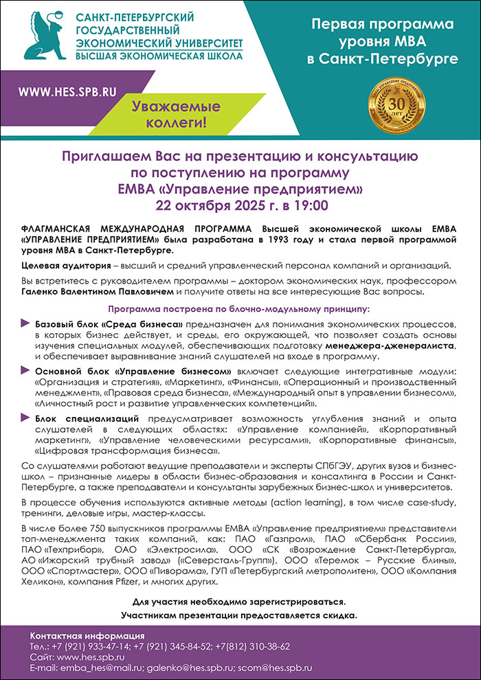 E-mail: emba_hes@mail.ru ; galenko@hes.spb.ru ; scom@hes.spb.ru